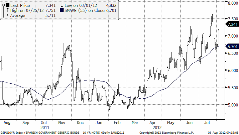 Vad som sker i EU är att det finns en social acceptans att banker tas över av staten därför att man inte vill uppleva obehaget av att bankerna går under var och en för sig, Detta gör att det är rimligt att anta att staternas i fråga egentliga skulder är deras egen statsskuld + bankernas skulder. När man studerar den typen av skuldberg i förhållande till de här ländernas skatteintäkter, får man en skrämmande bild. Än så länge försöker man skjuta upp det oundvikliga. ECB:s satsning på att få ner räntorna i Spanien är det senaste och främsta exemplet på detta. Vi ser nedan hur räntorna har på deras tioårs statsobligation föll från 7.75 till 6.68. Efter Draghis tal igår steg räntorna återigen upp till 7.34% i skrivande stund.
