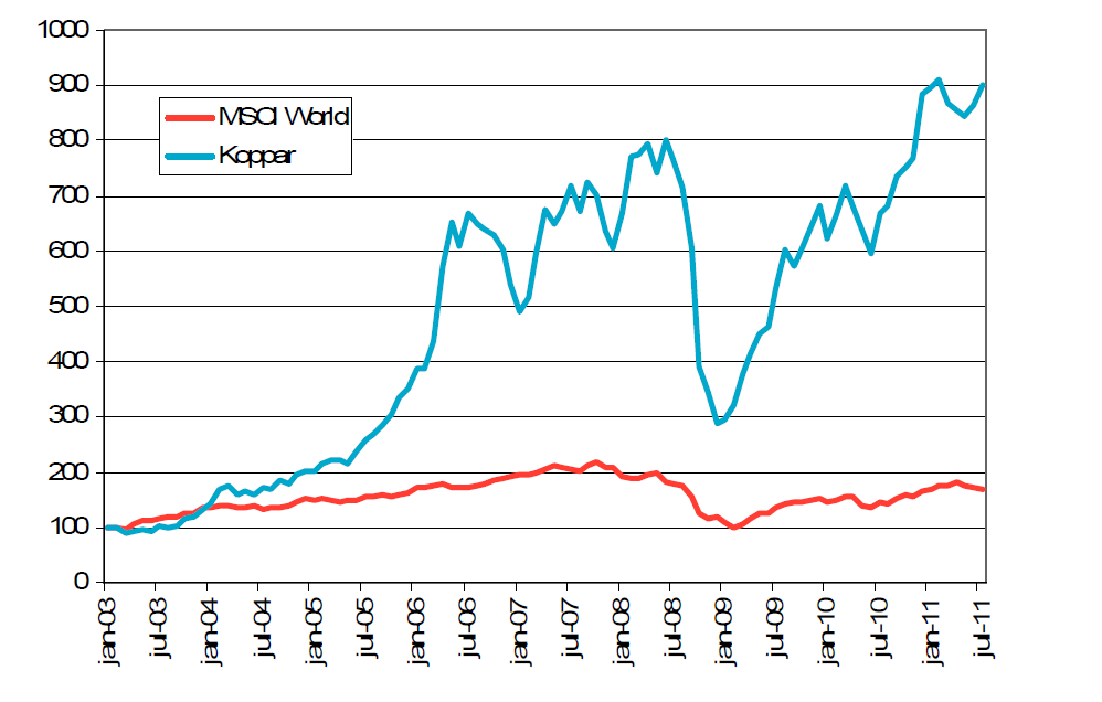 Den intelligente läsaren invänder kanske att koppar ser ut att ha högre risk. Det stämmer. Volatiliteten har legat på 30% i koppar och bara 16% i MSCI World. Så… med samma risknivå, hade 100 dollar i koppar bara blivit 450 dollar idag. Mot 170 dollar i MSCI World aktieindex. Så varför ska man spekulera i konjunkturcykler i aktier, när det finns ”Dr Koppar” som är mycket mer rätt på vad gäller konjunkturen och dessutom via ständig rabatt på terminerna erbjuder en förutsägbar riskpremie till investeraren?
