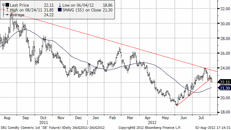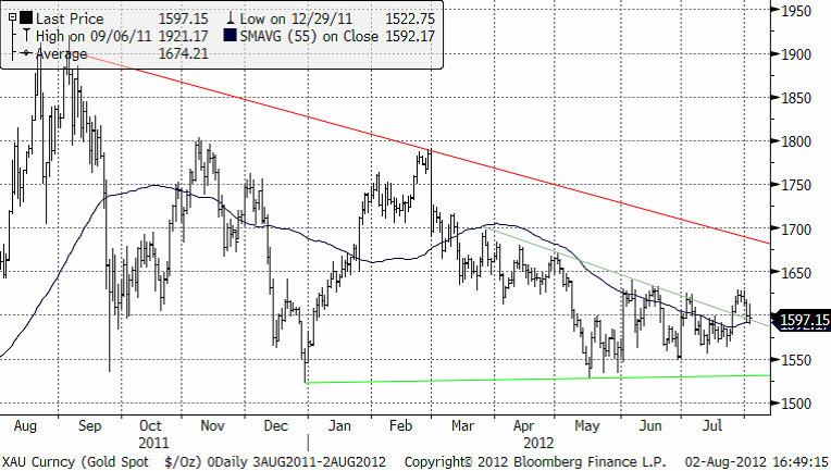 Den fundamentala kraften som verkar positivt på guldpriset är naturligtvis finanskrisen i Europa och skuldbergen runtom i världens stater. Men som vi ser nedan under jordbruksprodukter är momsunen (nederbörden) i Indien 21% sämre den här säsongen och torka råder. Det gör att guldefterfrågan från Indien, det största enskilda konsumentlandet, sannolikt kommer att minska. GFMS släppte en rapport om detta den 16 juli. GFMS har också sänkt efterfrågeestimatet för Kina till 870 ton på helåret. Tidigare trodde man att efterfrågan skulle nå upp till 1000 ton. Samtidigt fortsätter såväl Kina som Indien att stimulera, liksom ECB som för en tid sedan sänkte korträntan till 0.75%. Räntesänkningar brukar innebära högre guldpris.
