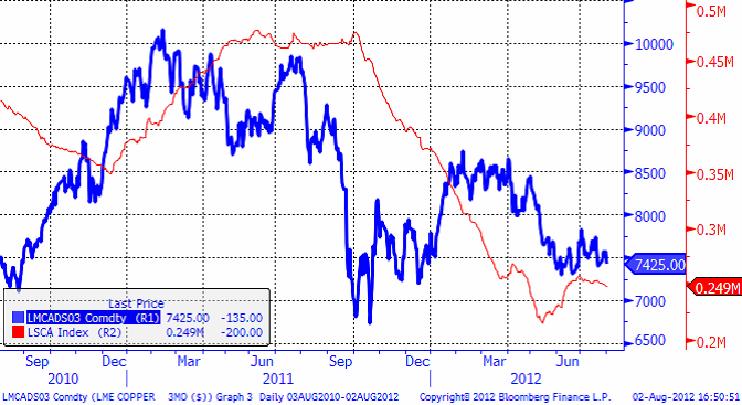 I nedanstående diagram ser vi kopparpriset och lagren i antal ton i LME:s lagerhus. Vi ser att lagernivåerna har fallit sedan mitten av 2011. Konsumtionen är alltså större än produktionen. Det är ingen mekanisk sanning, men allt annat lika ”borde” sjunkande lager i vart fall ge stöd åt priset.