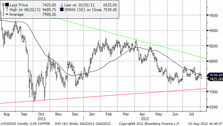 Som en anekdot producerade Kina 1,8 millioner mil kraftkabel första halvåret (430 varv runt jorden), innebärande en ökning med 13,7 % jämfört med samma period förra året. Kina kommer att konsumera mycket koppar även i framtiden, så mycket är klart, samtidigt som risken är stor att utbudet inte räcker till. Kina har utnyttjat varje större korrigering i marknaden till köp och ökad import. Mycket tyder på att det kommer att upprepas. Fråga är bara hur långt ner man ”släpper” marknaden. Den tekniska bilden kan ge oss viss vägledning. Den långsiktigt uppåtgående trenden kommer in ungefär vid $7000/ton (motsvaras av $3,18/lbs för Comex-kontraktet), ca 4,5 % under dagens nivå på $7330.