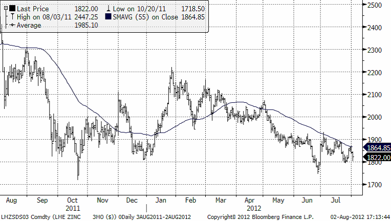 Zinkpriset ligger på bottennivåer i det prisintervall som etablerats sedan 2009. Produktionskostnaden för zink ligger på dessa nivåer. I råvarumarknaden brukar man kalla detta för råvarans ”fundamentala golv”. Vi ser därför inte några stora kursfallsrisker i zink.