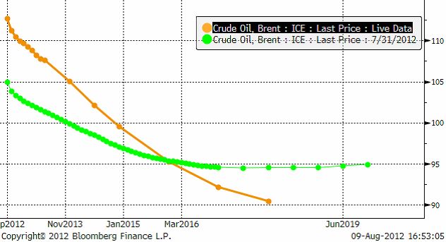 Brent crude oil prices have rebounded a bit along the forward curve. Not much strengthening in the structure of the curve. The front-end backwardation is not much stronger today than on its weakest level so far this year which was on Thursday last week.