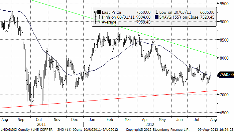 Förra veckans besvikelse, efter uteblivna besked om stimulanser både från FED och ECB fick priserna på basmetaller att falla tillbaka med 2-3 %. Vändningen kom sent i fredags (3:e augusti) efter den amerikanska arbetsstatistiken. Den amerikanska ekonomin skapade 160,000 nya jobb i juli mot väntat 100 000. Det räckte för att gjuta liv i marknaden och förra veckans förlorade mark hämtades igen. Det böljar fram och tillbaka i takt med stämningsläget på de finansiella marknaderna. Basmetaller handlas mer eller mindre i sidledes trender i avvaktan på nya makroekonomiska impulser.