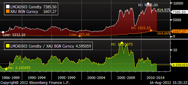 Det kan vara intressant att jämföra kopparpriset med ett par andra råvaror. Nedan ser vi priset på koppar i termer av guld. Enligt den jämförelsen ser koppar billigt ut.