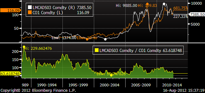 Nedan ser du koppar i termer av råolja. Även i denna jämförelse ser koppar billigt ut.