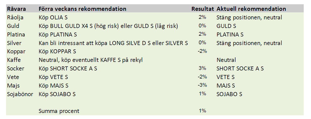 Vi tror på fortsatt sidledes prisrörelse den närmaste veckan. Det är emellertid alltid bra att ha lite guld i portföljen, eftersom priset reagerar positivt på oväntade negativa händelser, som brukar påverka alla andra tillgångsvärden negativt. Vi föredrar dock platina på kort sikt.
