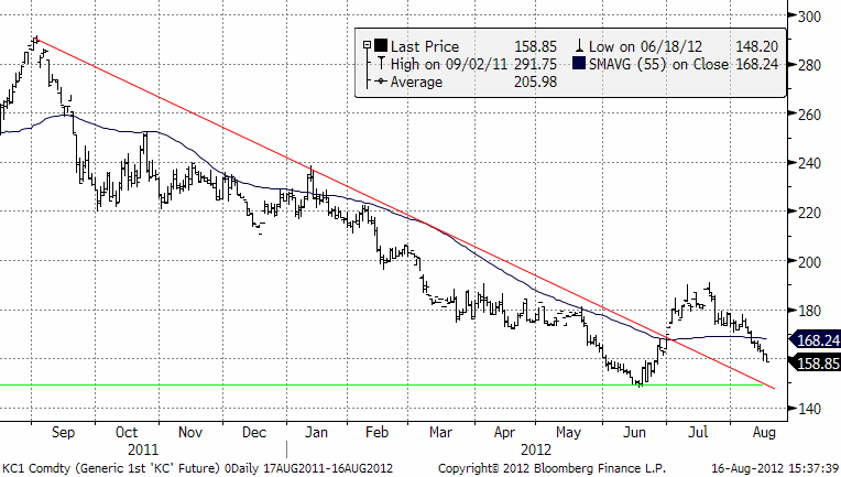 Det är möjligt att priset är på väg ner mot det tekniska stödet på 1.50 dollar per pund. Där kan man kanske bottenfiska KAFFE S.