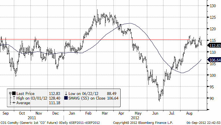 Uppgången in i motståndsområdet verkar ha kommit av sig, dock noteras även stöd i ett glidande 233-dagars genomsnittsband ($113.30 / 110.00), men skulle utbudet vara så stort att efterfrågan i detta området mättas så räknar vi med fall ner in i ett bredare ~$108 / 101 område. Nya toppar krävs nu för att minska den kortsiktiga nedåtrisken.