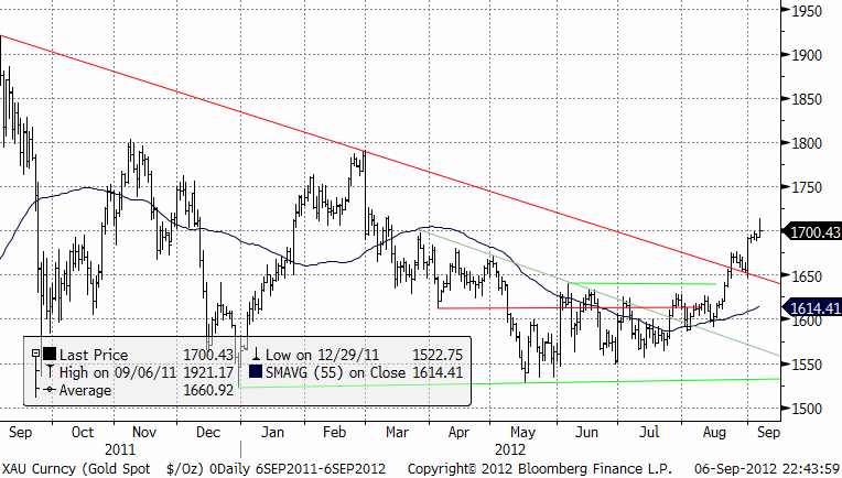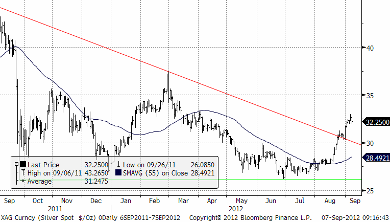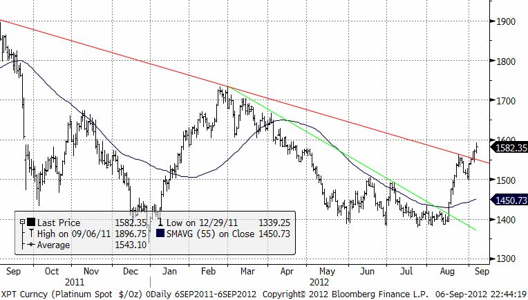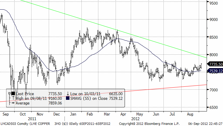 Bernanke’s tal förra veckan gav inte några nya indikationer. De penningpolitiska stimulanserna kanske dröjer någon månad till. Blickarna vändes istället mot ECB:s räntebesked idag torsdag. Draghi bekräftade obligationsköp. Det var det som marknaden ville höra och priserna steg. Basmetaller har gått starkt i veckan och är upp mellan 2 och 3 %. Veckan inleddes annars med Kinas index är nu under den psykologiska 50-nivån. Negativa siffror således och basmetaller brukar följa ISM, men inte nu paradoxalt nog. Aktörerna väljer att se dem som en bekräftelse att Kina måste göra någonting. Frågan är bara vad och hur mycket.
