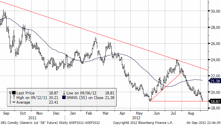 Priset på socker har studsat upp från strax under 20 cent och ligger nu på nästan exakt 20 cent. Trenden är ner, men trenden är också gammal.