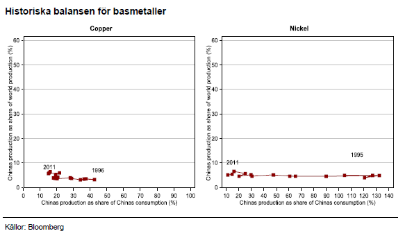 Koppar och nickel är de två metaller där Kina i särklass har störst importbehov. Någon ljusning för kineserna går inte att skönja. Efterfrågan på nickel kommer dock inte växa lika explosionsartat som för koppar då nickel främst drivs av konsumtionsvaror. Däremot så råder en ökad oro kring Indonesiens ovilja att exportera oförädlade råvaror. Indonesien står för 60 och 70 % av Kinas import av NPI (Nickel pig iron). Zinkproduktionen från Kinas gruvor har stadigt ökat vilket är en effekt av att Kina lyckats effektivisera den tidigare småskaliga gruvproduktionen.