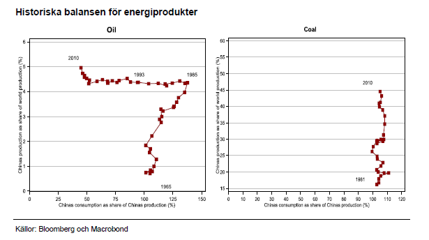 Energi har en mycket central roll i Kina. Landet hade aldrig kunna industrialiserat utan tillgången på billigt kol. Olja är en resurs som landet lider stor brist på och importen kommer fortsätta. Idag importerar Kina 50 % av sin oljekonsumtion och står bara för 5 % av globala produktionen. Energibesparingar står högt på agendan. Stålindustrin står för en stor del med accepteras då stålet behövs för urbaniseringen. Oljan driver på inflationen och NDRC tillämpar en prismodell för bensin och diesel som baserar sig på priset för en korg med Brent, Dubai och Cinta (Indonesien). Om korgens pris rör sig mer än 4 % under en period på 22 dagar kan NDRC ändra priset på bensin och diesel i Kina. Priset på WTI olja är alltså ointressant för Kinas oljepris och inflation. Om vi tar Pekings provins med 20 miljoner invånare som exempel på en mogen marknad i Kina så kommer 30 % av energikonsumtionen från kol. Andelen ska ner till 25 % till 2015. Förnyelsebara källor står för 3,2 % och investeringar i solteknologi lyfts ständigt fram. Övriga 66,8 % kommer från olja.