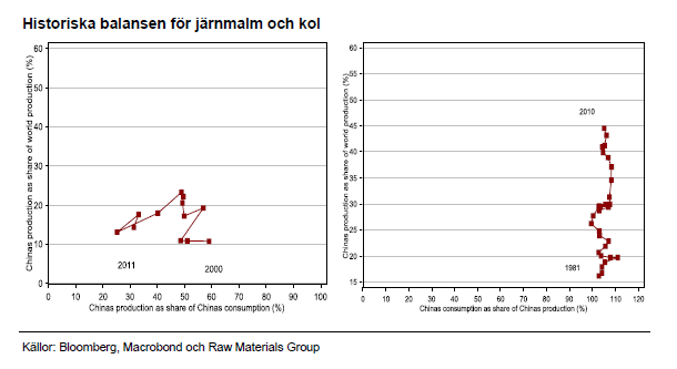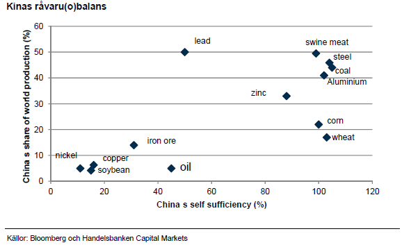 Följande ”scatter-grafer” har kinas självförsörjningsgrad på x-axeln och kinas andel av världsproduktionen på y-axeln. Kina är och kommer att vara nettoimportör av nickel, koppar, järnmalm, soja och olja. För övriga livsmedel, stål kol och aluminium så är landet självförsörjande och zink närmar sig självförsörjande. Det är i den första kategorin som Kina har ett stort importbehov som landet påverkar det globala priset. Speciellt för järnmalm där landet står för 40 % av globala efterfrågan. Det är uppenbart att Kina haft som strategi att expandera produktionen av de råvaror som man har inhemsk tillgång till. Grafen nedan visar 2011 års balans och det finns nu två tydliga grupperingar mellan råvaror kina kan producera och efter senaste decenniets expansion nått självförsörjning och den grupp man har svårt att expandera och måste förlita sig på importen för.