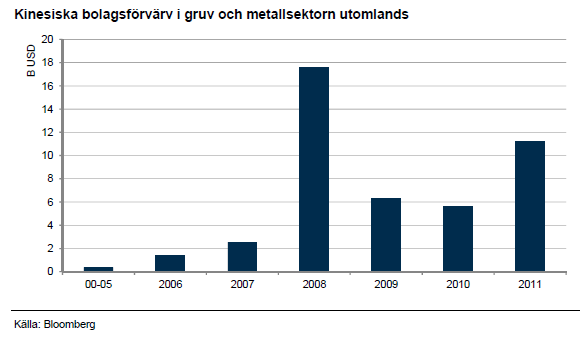 “Vi behöver inte deras pengar och de har ingen kunskap att tillföra våra bolag” Citatet är hämtat från en konversation med en australiensisk gruvchef under en konferens för några år sedan. Det återspeglar det bemötande som kinesiska direktinvesteringar i råvarubolag får i Australien och Nordamerika. Sydamerika och Afrika är annorlunda och det är där Kina fått gå in i gruvprojekt i tidiga stadier.