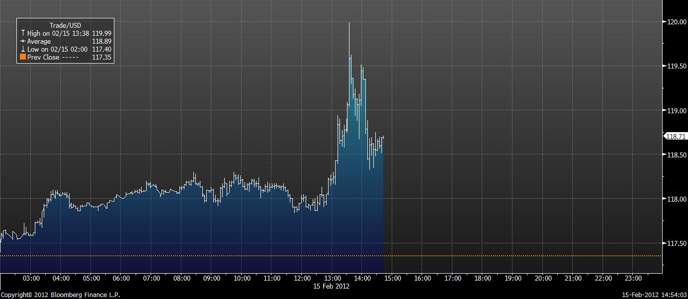 Graf: Brentprisets reaktion på Irans exportstopp till EU, källa Bloomberg