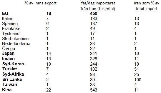 Tabell: Irans oljeexport jan-jun 2011, källa EIA (Energy Information Administration, USA)