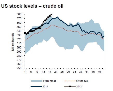 Oljemarknaden föll tillbaka till 15-månaders lägsta och under 100 dollar efter att usla amerikanska jobbsiffror tyngde sentimentet ännu mer. Endast 69,000 nya jobb samtidigt som vårens siffror reviderades ned och arbetslösheten steg till 8.2 procent. De pågående förhandlingarna med Iran går framåt vilket förbättrat utsikterna för ett avtal och minskad risk för utbudsstörningar i den Persiska viken. På kort sikt finns det inte mycket som talar för ett ökande oljepris om man ser till lagersituationen , svag makrostatistik samt en fördjupad skuldkris i Europa. Lagertrenden på olja, se nedan, bör dock vända när vi nu går in i den amerikanska sk körsäsongen.