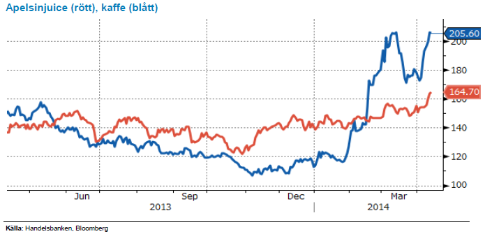 Efter den ovanligt kalla vintern i USA och uteblivet regn i Brasilien, väntas årets apelsinskörd bli den lägsta på 29 år. Brasilien som världens största – och Florida som världens näst största apelsinproducent har drabbats hårt i år. I veckan steg terminspriserna på apelsinjuice ytterligare till två-årshögsta efter att amerikanska jordbruksdepartementet, USDA sänkte den amerikanska apelsinodlingens estimat för mars månad för 2013/14 jämfört med föregående månad. I Florida härjar den bakteriella citrussjukdomen även kallad Citrus greening som får apelsinerna att skrumpna och lossna innan de hunnit mogna. Och i Brasilien har torkan slagit hårt mot apelsinerna. Om Citrus greening får spridning kan det påverka flera års skördar, varför vi ser viss risk på uppsidan.