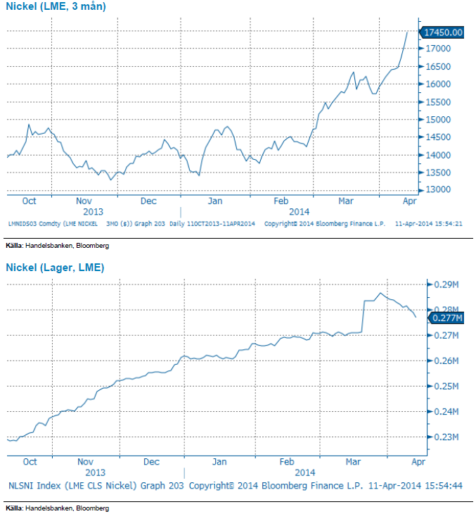 Sedan vi publicerade vårt nickel case den 1 april har priset (LME:s 3 mån) stigit med dryga 10 %, upp hittills i år med hela 25 %. Indonesiens exportstopp av oförädlad nickelmalm börjar nu påverka utbudet, men även oro för bortfall från Ryssland oroar. Kinas lager av malmen börjar sina och även LME:s lager av nickel faller, ned 1,8 % på veckan vilket är den största nedgången sedan juni 2012. Det har dock ryktats att man i Indonesien skulle lätta på sitt exportförbud, i syfte att stimulera sysselsättningen inför stundande val. De aktörer vi talar med i den fysiska nickelmarknaden vittnar samtidigt om att det blir allt svårare att köpa nickel för leverans. Vi håller därför fast vid vår positiva syn på nickel även efter från dessa prisnivåer.