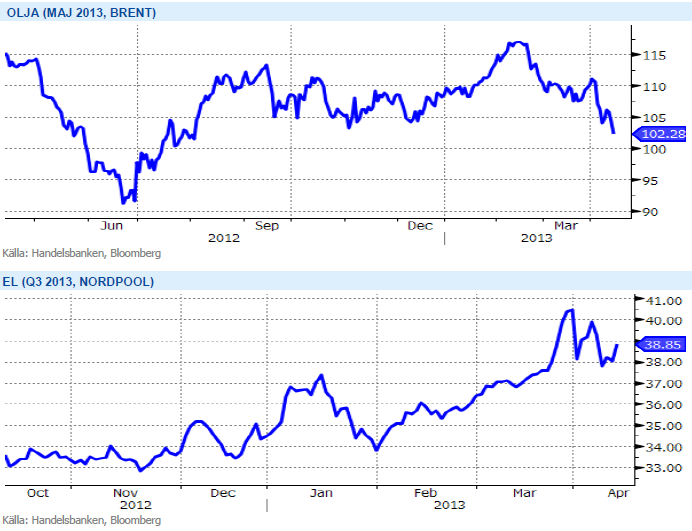 Oljan lyckades återhämta sig något under veckans första dagar för återigen försvagas på oro för Cypern och försäljningssiffror från USA inte motsvarade förväntningarna. Retail sales kom in på niomånaderslägsta vilket fick oljan ner till 101 USD/fat – på en nivå vi inte sett sedan juli 2012. Vi fortsätter tro att oljan har ett starkt stöd omkring 100 USD, såsom varit fallet i snart 2,5 år. Allt svagare makrodata har helt enkelt satt sina spår i makroråvaran nummer ett; oljan.
