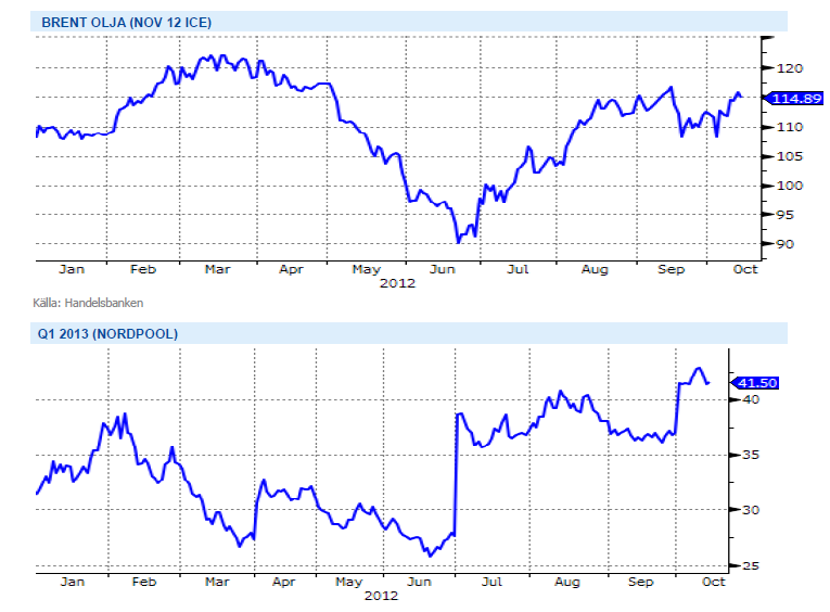 Oljepriset (Brent) handla just nu kring 115 USD/fat. Veckan har varit relativt volatil men vi slutar men en veckouppgång på 2.6%. Det som styrt oljepriset har främst varit händelser i Mellanöstern. Turkiet har hotat att eskalera konflikten mot Syrien samtidigt som det skett attacker på naturgasledningar mellan Syrien och Turkiet. Irans export närmar sig noll på grund av sanktionerna från USA och EU vilket sätter press på oljeutbudet.