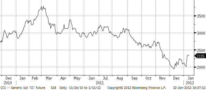 Kakaopriset rörde sig mellan ett intervall av $3774 -1936/ton under 2011. Kakaopriset stängde på $2109/ton vid årets slut, en nedgång med ca 40 procent sedan årets början. Goda väderförhållanden, globalt överskott och lägre konsumtion av kakao samt det svaga ekonomiska läget i världen har lett till att kakao tillhört de råvaror med sämst prisutveckling under förra året.