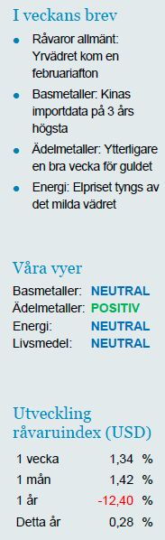Basmetallerna fortsätter att handlas upp något även denna vecka. Under februari har vårt basmetallsindex stigit med 2,2 %. Importdata för januari från Kina visar på rekordhög import på bland annat koppar. Risk finns dock att den höga siffran har påverkats av kinas nyår då tullverket pappersarbetet forcerats inför nyårsledigheten. Vi väntar med andra ord att februaris import kommer in betydligt svagare.