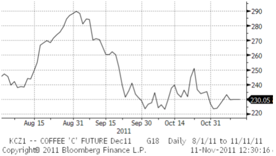 Kaffepriset har sedan slutet av september handlats i ett intervall mellan 253 och 223 USD/lb. Den första november sjönk kaffepriset till den lägsta nivån på fyra veckor. Detta tycks vara en reaktion på allmän finansielloro, främst från euroområdet. Under torsdagen har priset dock återhämtat sig och handlades mitt i intervallet.