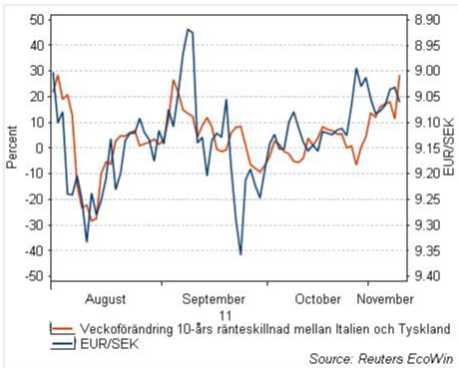 Stämningen på marknaden har under veckan pendlat från eufori till nedstämdhet. Veckan började med en uppgång på aktiebörserna, bland annat driven av rykten om Berlusconis avgång som premiärminister. De senaste dagarna har dock präglats av en uppgivenhet inför problemen i Europa eftersom marknadernas aktörer misstror det europeiska ledarskapets förmåga att lösa skuldproblematiken. Italienska statspapper var i fokus under veckan och handlades som högst till en ränta på 7%.