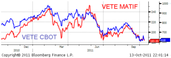 Vetepriserna har rört sig mycket under den gångna veckan. I tisdags steg priserna kraftigt i både Chicago och Paris sedan osäkerheten ökat med uttalanden om att Ryssland eventuellt inför exportskatt på spannmål i syfte att begränsa exporten till 24 miljoner ton. Det ska dock tilläggas att en total export om 24 miljoner ton spannmål skulle innebära en veteexport om ungefär 20 miljoner ton, vilket trots allt är 2 miljoner ton mer än USDA uppskattade den ryska exporten till i onsdagens rapport. Rykten om att Ukraina eventuellt tar bort exportskatter på spannmål redan i början på nästa år har bidragit till en ökad osäkerhet.