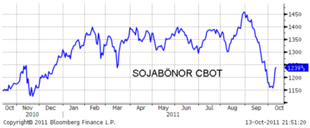 Kinas sojaimport för 4:e kvartalet 2011 beräknas till 14,2 miljoner ton, en tydligt ökad efterfrågan har märkts av efter den senaste tidens prisfall. I veckan har Kina köpt 700.000 ton sojabönor av amerikanskt eller sydamerikanskt ursprung.