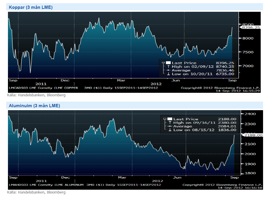 Basmetallerna fick sig en rejäl skjuts uppåt under veckan. Metallerna fick hjälp av det allmänna risksentimentet i början av veckan och fick givetvis ytterligare dragkraft när QE3 annonserades igår kväll.