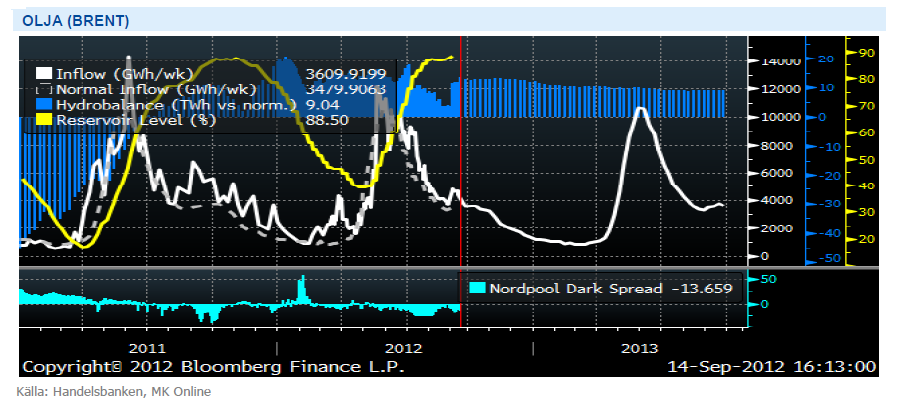 Brytpriset for kolgenererad kraft, vilket brukar fungera som stöd, ligger på ca 38 euro men vi har svårt att det skall gå ändå dit eftersom vi har långt fram till vintern där man ofta söker en riskpremie för eventuell kyla och bortfall av kärnkraft. Som vi skrev i förra brevet finns det egentligen ingen faktor som pekar upp så länge vädret inte slår om till extremt torrt eller kolet finner styrka. Vi tror däremot att marknaden diskonterat för de nederbördsmängder som väntas och ligger kvar med neutral till kort position om det visar sig att hela den förväntade nederbördsmängden faller ut.