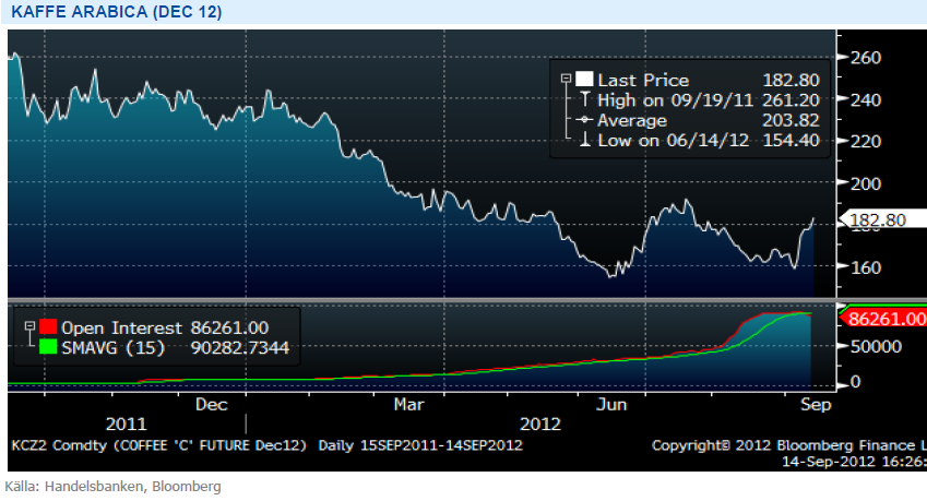 Torka i Brasilien vilket kan komma att påverka den kommande skörden negativt har fått priset på Arabica kaffe att stiga under veckan. Mer nederbörd behövs de kommande veckorna för att optimera skörden och i dagsläget ser 10dygns prognosen inte lovande ut. Man ska också komma ihåg att vi nu står inför den lägre producerande Brasilianska skörden (två års skördecykel). Colombia, näst största producent av Arabica kaffe, har drabbats av ogynnsamma väderförhållanden och dåliga skördar de senaste 4 åren. En svagare El Nino skulle kunna vara gynnsamt för den kommande skörden. Positiva siffror i juli talar för en ökning av den totala colombianska skörden som avslutas i slutet av september (jämfört med året innan som producerade färre än 8M säckar). De senaste 50 åren har den genomsnittliga skörden av arabicabönor i Colombia varit 11M 60kg säckar.