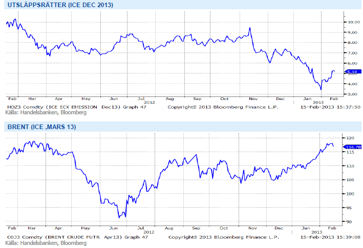 Vi hade väntat oss en lugn vecka på råvarumarknaden när kineserna hade ledigt efter söndagens nyårsfest. Volymerna har visserligen varit lägre men det har ändå varit intressanta rörelser. Guld bröt ner genom sitt starka tekniska motstånd på 1545 och vi skickade idag ut en handels ide där vi tycker att man ska sälja guld med 1550 som mål. Att sälja guld nu är logiskt med vår tro på en starkare konjunktur och en utbredd ”risk on” mentalitet på marknaderna. Vi sätter också större tilltro till de tekniska signalerna för guld än för övriga råvaror då guld har mindre fasta kopplingar till den fundamentala bilden. Vår tro på starkare oljepris håller i sig och under veckan har Brent åter varit uppe över 119 USD. Inte mycket nytt kom ut från Iranmötet i tisdags utan sanktionerna mot Irans oljeexport till USA och EU ligger kvar. Inga nya möten är planerade.