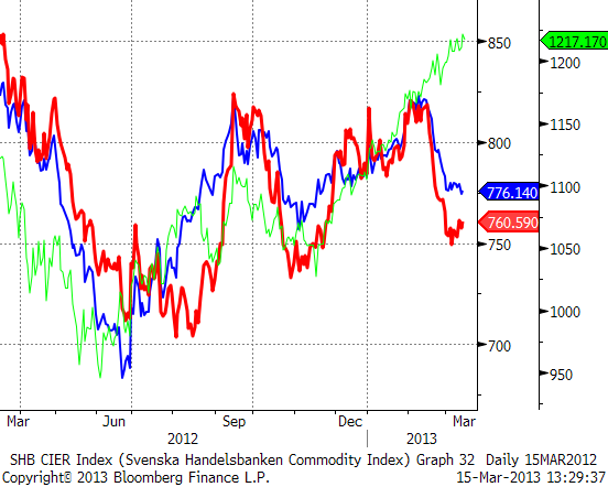 Nedan finner du en graf ser du hur Handelsbankens Basmetallindex (rött) rört sig i förhållande till Råvaruindex (blått) och OMX 30 (grönt).