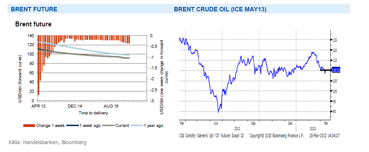 Oljan återhämtar sig mot slutet av veckan efter positiva amerikanska arbetslöshetssiffror och en svagare dollarutveckling. Samtidigt som Sudan meddelat att man beordrat alla utländska oljebolag och operatörer att återuppta oljeproduktionen (350kbpd) efter avmilitarisering i området kring gränsen mot södra Sudan, finner oljan fortsatt stöd från risk för produktionsbortfall. President Obama besöker Israel nästa vecka och diskussioner kring Iran´s kärnvapen och en förlängning av sanktionerna är självklart en intressant punkt på agendan. OPEC har dock signalerat att man är beredd att skruva upp produktionen med ytterligare 300kb (+1.2%) under de kommande veckorna för att täcka upp efterfrågan så fundamentalt är det svårt att motivera köp på dessa nivåer. Däremot verkar oljan finna stöd på strax under 110 så vi bedömer att potential just nu finns på uppsidan. Lägg därtill en fortsatt backwardation (avdrag) på Brentterminerna om ca 6 procent 1 år ut vilket gynnar ett innehav.