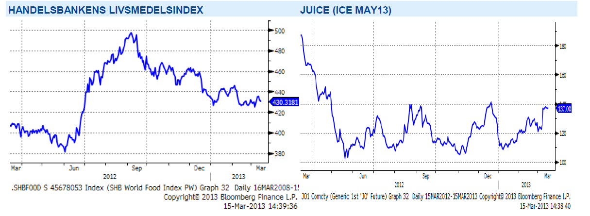 På kaffemarknaden väntas rekordskördar i Brasilien där produktionen beräknas öka från 47 till 48 miljoner bags (1 bag = 60 kg) för säsongen 2013/-14. Kaffe är en varannan-år-råvara och efter ett år (2012) med rekordskördar brukar normalt året efter innebära ett produktionsbortfall med omkring 30 procent. Men med bättre beskärningsteknik och ökat antal planterade träd per hektar har man i år lyckats minska produktionsbortfallet till omkring 10 procent. Vi har med anledning av detta noterat fallande priser efter en svajig tid med delvis stigande priser som följd av oroligheterna kring svampsjukdomar i Centralamerika. Juice är en av råvarorna som stigit mest i år, upp 18 procent sedan årsskiftet.
