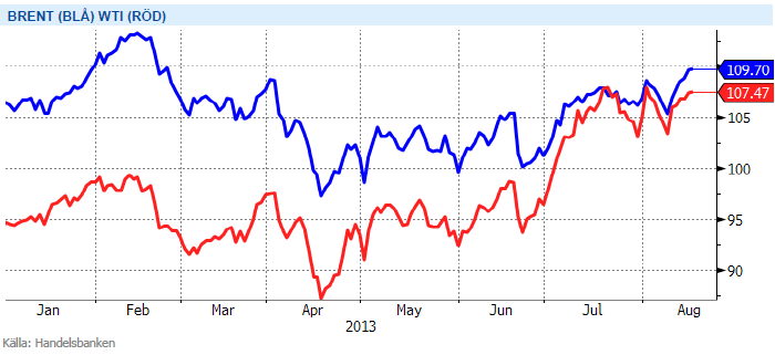 Stigande WTI olja och efterföljande Brent har dragit rubriker i sommar. För WTI handlar det mest om att logistiska knutar har lösts upp i USA och ökat utflödet från Cushing som är leveranspunkten för WTI. Lägre lager som sammanföll med stark bensinefterfrågan under driving season stärkte också priset. Brentoljan har också stigit, drivit av högre WTI och oroligheterna i Egypten/ Mellanöstern. Egypten i sig är inget stort oljeland men som stor ekonomi viktig för regionens (in)stabilitet. Presidentbyte i Iran har ännu inte lett till förändrad kommunikation kring sanktionerna. Rouhani är dock mer västvänlig än sin föregångare. I dagsläget är utbudstörningar i Irak mer prisdrivande. Ökat våld och politiskt vakuum har fått produktionsutsikterna på fall. Irak är idag OPEC:s näst största medlem sedan sanktionerna mot Iran infördes. Saudi har redan växlat upp produktionen för att kompensera vilket fått ner Brent något. Saudis roll är alltså inte över trots den boomande oljeproduktionen i USA.