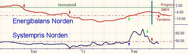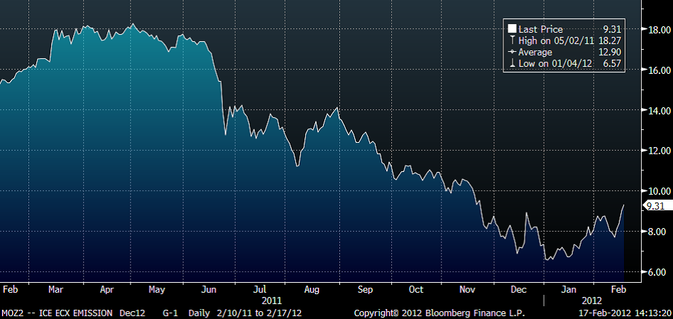 Med ett stabilt läge i magasinen och god tillgänglighet på kärnkraft samt ett stort utbud av energikol ser vi därför ingen större risk för att marknaden stiger kraftigt även om det skulle komma in lite kyla i prognoserna efter helgen. Det enda som verkat för uppsidan är egentligen utsläppsrätterna som stigit med hela 18.5 procent efter att EU Parlamentets Industriöverskott signalerat en minskad tillgång på rätter inom handelssystemet för fas 3. Anledningen till att EU-parlamentet driver frågan är den kraftiga nedgången i pris som skett senaste tiden (se graf). Parlamentarikerna anser att nuvarande (låga) nivå inte skapar rätt incitament för att dra ned på de europiska koldioxidutsläppen. Föga förvånande har den energiintensiva industrin protesterat kraftigt och menar att slumpmässiga ändringar av spelreglerna i en marknad kommer att få den sluta fungera på sikt. Det råder fortfarande en viss osäkerhet kring detta vilket gör att få vågar lägga sig korta och mer information väntas efter omröstningen den 28 februari följt av en kammaromröstning den 17 april. Elmarknaden är åter i balans utan någon drivande faktor varför vi ändrar den kortsiktiga vyn från kort till en mer neutral position.