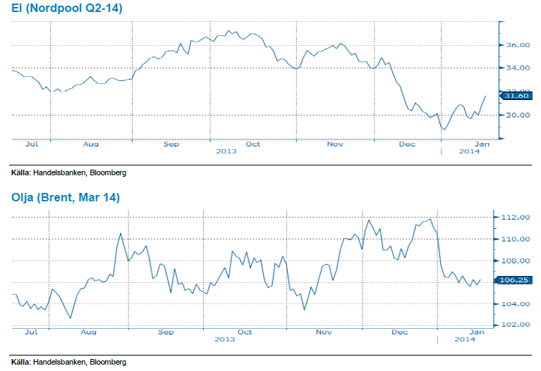 Som vi skrev förra veckan har väderskiftet till kallare och torrare väder har drivit upp både spotpriset och terminspriser. Q2-14 (underliggande till SHB Power) har stigit med nästan 7 % under veckan. Det hydrologiska läget för norden har försämrats marginellt och ligger nu runt –2.8 TWh. Vi bedömer att energiunderskottet kommer att fortsätta öka på grund av betydligt högre lastnivå och en prognostiserad nederbörd under normalt.