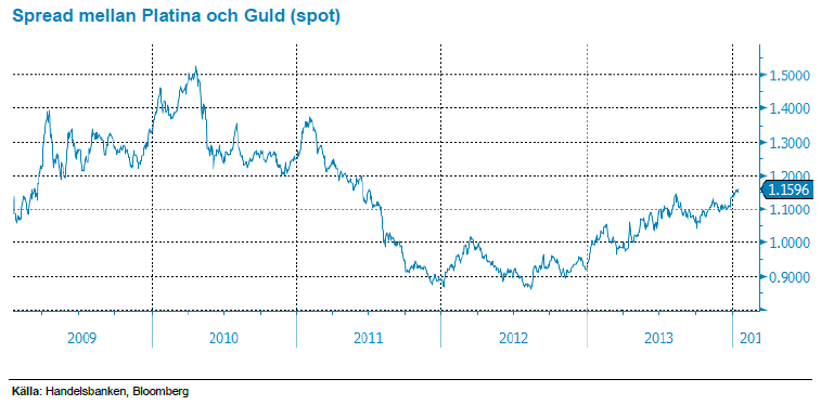 Vi lägger en ganska händelselös vecka för guldet till handlingarna, en marginell prisnedgång och tight range utan nya signaler eller nyheter. Vår negativa vy ligger kvar intakt, även om vi – som vi beskrev förra veckan – kan se möjligheter för den riskvillige och opportunistiske köparen. En av våra favorittrades från förra året kan vara smart i detta läge – lång platina mot guld. Denna beskrev vi helt kort i Börsrummet 17 juni, och denna spread har sedan början av 2013 stigit med nära 26 % (varav 12 % sedan den 17 juni…). Det betyder att platina blivit 26 % mer värt RELATIVT guldet, fast att även platina föll under 2013. Fördelen med en ”marknadsneutral” position i två olika ädelmetaller mot varandra är att man inte behöver riskera att sitta fel i en rekyl uppåt i guldpriset, även om man – som vi – är negativ till guldet.