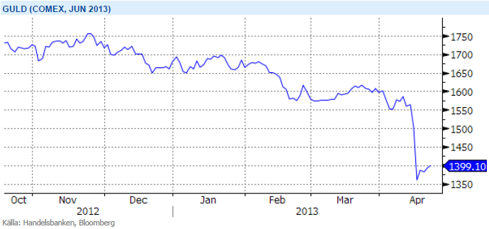 Guldet blev denna veckas stora samtalsämne efter att på måndagen ha fallit med över 11 % jämfört med fredagskvällens notering. Det cirkulerade många försök till förklaringar till den stora och plötsliga rörelsen, och varför den skedde just nu. Vi har inga bra svar på timingen, men konstaterar att det är en rörelse vi väntat på, och vi tror inte att den är över i och med detta fall. Vi har nu fallit med 26 % från toppen hösten 2011, och 16 % hittills i år. Silvret däremot – guldets sprallige lillebror – har mer än halverats sedan toppen, och fallit 22 % i år. Den stora frågan nu är naturligtvis huruvida det ska fortsätta, och isåfall hur långt.