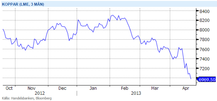 Basmetallerna har haft ytterligare en vecka med fallande priser, där koppar tappat dryga 6 % och handlas nu under 7000 USD – i nivå vi inte sett sedan oktober 2011. Förhoppningar på Kinas konjunkturuppgång har inte infriats och med ett USA som samtidigt släpper svagare data har fått konjunktur känsliga metaller att falla. I närtid finns risk för mer dålig USA data och för Kina ororas vi av att de stimulanser som lanserats redan verkat i indikatorer och det finns därför inte mer lanserad stimulansdriven tillväxt att vänta i barometerdata.
