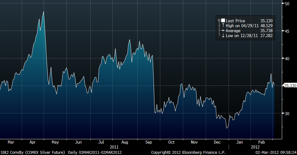 Även silver har haft en volatil vecka, men nedgången blev blygsamma 0.8%. Uppgången under 2012 kan summeras till 19 %, vilket är den största uppgången av alla ädelmetaller. Silverpriset har gått ned mindre relativt guldet och vi anser att anledningen bakom det är att silvret ses som en industriell metall. Silverpriset har även funnit stöd från rapporter om stora nettoinflöden i ETF:er (Exchange Traded Funds). Vi intar en negativ hållning till silver, trots vår tro om en positiv utveckling av världsekonomin. Framförallt tror vi att en starkare dollar kommer påverka silverpriset i negativ riktning.