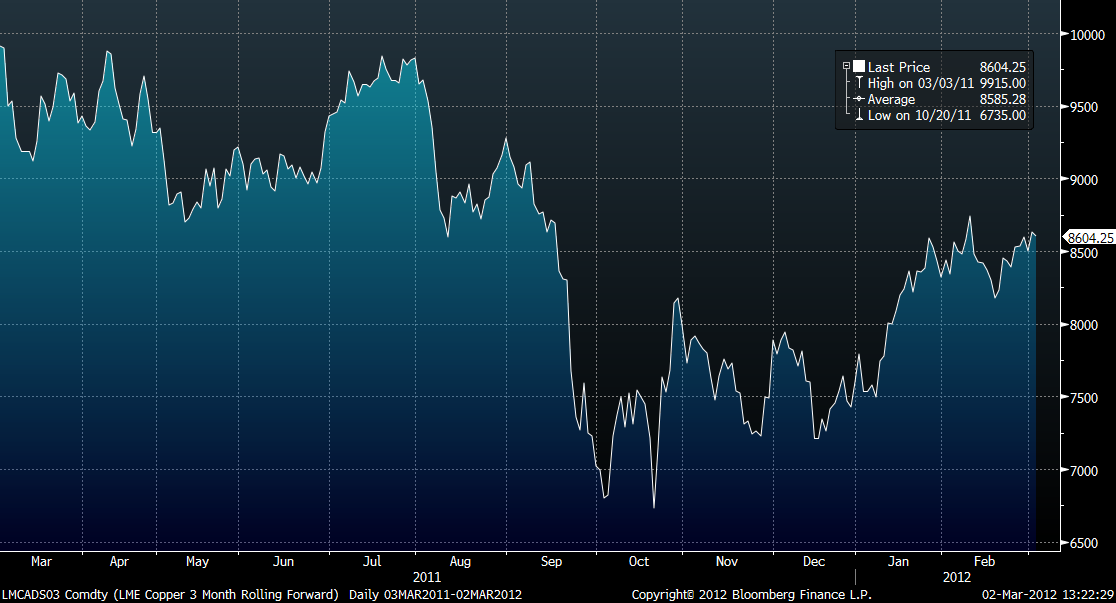 Basmetallerna stänger veckan med blandat resultat, upp för samtliga metaller förutom nickel och bly som föll med 2,5 % respektive 1,5 %. Året har börjat starkt för metallerna samtidigt som lagernivåerna fortsatt att stiga på både i Kina och LME. I och med ECB:s LTRO2 finns det dock anledning att tro på stigande priser på basmetaller.