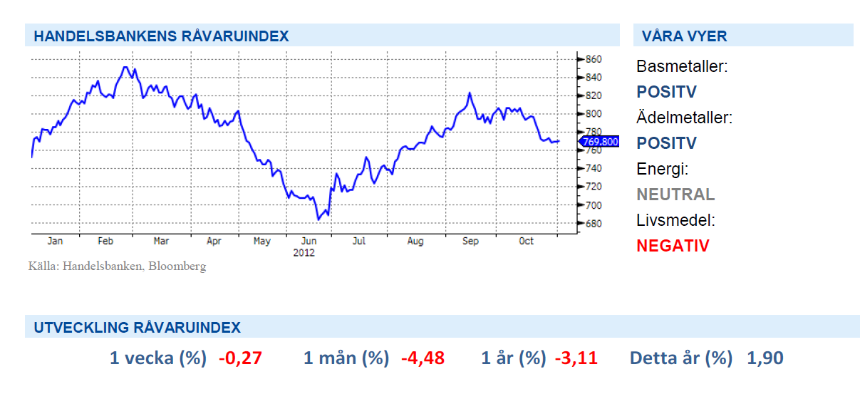 Vi lämnar nu oktober och vi kan konstatera att månaden som gått bjöd på fallande priser på råvaror. Prisfallet på både metaller och energi ledde till att råvaror har haft det största fallet sedan maj under oktober månad med 4 %. Därmed ligger nedgången i paritet med börsen för samma period. Investerares optimism grusades av bland annat att IMF reviderade ner de globala utsikterna för tillväxt. Kina har rapporterat det sjunde kvartalet i rad med fallande tillväxt och inbromsningen i de 17 euroländerna fortsätter.