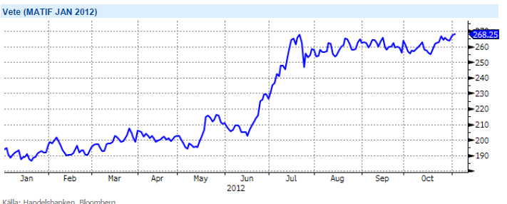Terminspriser på vete har gått upp något sedan förra veckan i både Chicago och Paris. Det amerikanska höstvetet har längtat efter regn under en lång tid och skicket på grödan bedöms nu vara det värsta på 20 år vid den här tiden på året – vi har flera gånger sett att en dålig gröda lyckats återhämta sig väl efter vintern om vädret tillåter men helt klart har oron nu ökat. Det torra vädret har dock snabbat på sådden något, för vilken nu omkring 10 procent återstår. Något regn från stormen Sandy verkar inte ha nått de viktiga veteregionerna i USA i större utsträckning, vilket det talades mycket om i början av veckan.