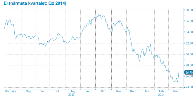 Vi har mot slutet av veckan haft en kraftig uppgång på elmarknaden och de korta kontrakten. Kvartalet Q214 (som är underliggande för våra investeringsprodukter på elmarknaden) har stigit närmare 8 procent under veckan som ett resultat av väderomslag och vi är nu tillbaka på de prisnivåer som handlades under början av mars. Efter en period med väldigt mycket nederbörd ser vi nu torrare prognoser som domineras av högtryck från öst. När såväl energikol, utsläppsrätter, och gas handlas relativt oförändrat samtidigt som kärnkraften går som den skall tenderar marknaden bli väldigt väderstyrd. När en prognos som tidigare visat på extremt mycket nederbörd och där de våta dagarna försvinner i framkant, en förändring på 4-5 TWh som i detta fall, ja då är det klart att marknaden reagerar extra mycket.